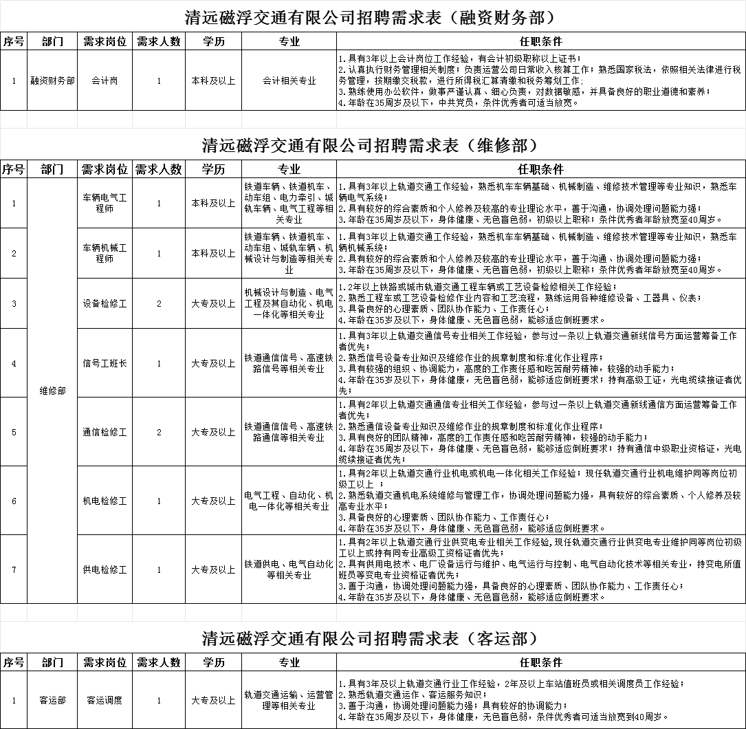 2、資料提交:應(yīng)聘人員下載填寫附件《清遠磁浮交通有限公司招聘報名信息登記表》連同身份證、學(xué)歷證、職稱證、專業(yè)技術(shù)資格證等報名資料壓縮打包后發(fā)送至電子郵箱qycf_zp@163.com;郵件名稱請按“應(yīng)聘崗位+姓名+專業(yè)”格式命名。